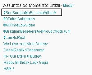 Ontem (28) fãs colocaram a tag #SeuSorrisoMeEncantaArthurA em 1° lugar nos TT's Brasil para Arthur Aguiar dizendo que o sorriso dele os encanta.